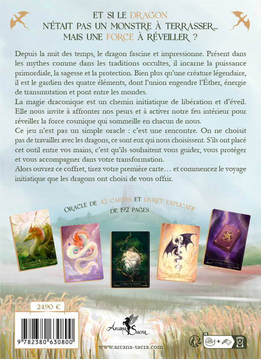 Depuis la nuit des temps, le dragon fascine et impressionne. Présent dans les mythes comme dans les traditions occultes, il incarne la puissance primordiale, la sagesse et la protection. Bien plus qu’une créature légendaire, il est le gardien des quatre éléments, dont l’union engendre l’Éther, énergie de transmutation et pont entre les mondes. La magie draconique est un chemin initiatique de libération et d’éveil. Elle nous invite à affronter nos peurs et à activer notre feu intérieur pour réveiller la force cosmique qui sommeille en chacun de nous. Ce jeu n’est pas un simple oracle : c’est une rencontre. On ne choisit pas de travailler avec les dragons, ce sont eux qui nous choisissent. S’ils ont placé cet outil entre vos mains, c’est qu’ils souhaitent vous guider, vous protéger et vous accompagner dans votre transformation. Alors ouvrez ce coffret, tirez votre première carte… et commencez le voyage initiatique que les dragons ont choisi de vous offrir.