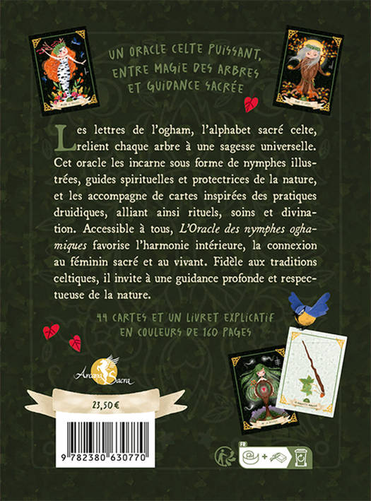 Un oracle celte puissant, entre magie des arbres et guidance sacrée. Les lettres de l’ogham, l’alphabet sacré celte, relient chaque arbre à une sagesse universelle. Cet oracle les incarne sous forme de nymphes illustrées, guides spirituelles et protectrices de la nature, et les accompagne de cartes inspirées des pratiques druidiques, alliant ainsi rituels, soins et divination. Accessible à tous, l’Oracle des nymphes oghamiques favorise l’harmonie intérieure, la connexion au féminin sacré et au vivant. Fidèle aux traditions celtiques, il invite à une guidance profonde et respectueuse de la nature.