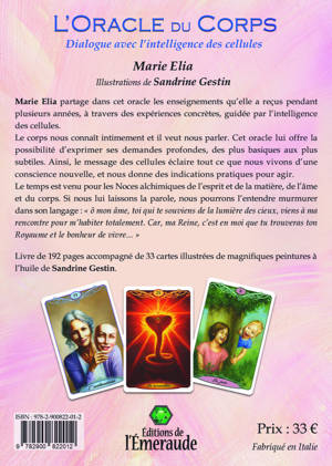 Marie Elia partage dans cet oracle les enseignements qu’elle a reçus pendant plusieurs années, à travers des expériences concrètes, guidée par l’intelligence des cellules. Le corps nous connaît intimement, et il veut nous parler. Cet oracle lui offre la possibilité d’exprimer ses demandes profondes, des plus basiques aux plus subtiles. Ainsi, le message des cellules éclaire tout ce que nous vivons d’une conscience nouvelle, et nous donne des indications pratiques pour agir. Le temps est venu pour les Noces alchimiques de l’esprit et de la matière, de l’âme et du corps. Si nous lui laissons la parole, nous pourrons l’entendre murmurer dans son langage : « ô mon âme, toi qui te souviens de la lumière des cieux, viens à ma rencontre pour m’habiter totalement. Car, ma Reine, c’est en moi que tu trouveras ton Royaume et le bonheur de vivre… ». Livre de 192 pages accompagné de 33 cartes illustrées de magnifiques peintures à l’huile de Sandrine Gestin.