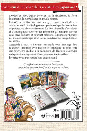 Bienvenue au cœur de la spiritualité japonaise ! « L’Oracle du Soleil levant » porte en lui la délicatesse, la force, le respect et la bienveillance du peuple nippon. Les 60 cartes illustrées avec un grand sens du détail sont autant un outil de développement personnel que les messagères de prédictions claires et intenses. Le livre fourmille d’anecdotes et d’informations poussées qui présentent de multiples facettes de ce pays fascinant et pourtant méconnu. Il propose également des exemples de tirages et un travail minutieux sur la signification des cartes. Accessible à tous et à toutes, cet oracle vous immerge dans la culture japonaise avec passion et simplicité. Il vous offre une expérience inédite à la découverte de l’histoire ésotérique du Japon, d’une sagesse et d’une puissance inestimables. Préparez-vous à un voyage hors du commun !