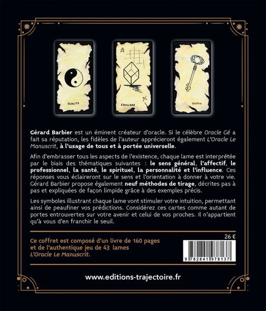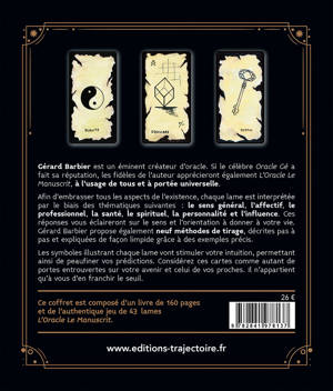 Gérard Barbier est un éminent créateur d’oracle. Si le célèbre Oracle Gé a fait sa réputation, les fidèles de l’auteur apprécieront également L’Oracle LeManuscrit, à l’usage de tous et à portée universelle. Afin d’embrasser tous les aspects de l’existence, chaque lame est interprétée par le biais des thématiques suivantes : le sens général, l’affectif, le professionnel, la santé, le spirituel, la personnalité et l’influence. Ces réponses vous éclaireront sur le sens et l’orientation à donner à votre vie. Gérard Barbier propose également neuf méthodes de tirage, décrites pas à pas et expliquées de façon limpide grâce à des exemples précis. Les symboles illustrant chaque lame vont stimuler votre intuition, permettant ainsi de peaufiner vos prédictions. Considérez ces cartes comme autant de portes entrouvertes sur votre avenir et celui de vos proches. Il n’appartient qu’à vous d’en franchir le seuil.