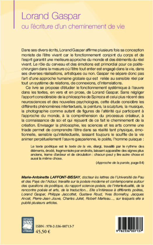Ce livre se propose d'étudier le fonctionnement systémique à l'oeuvre dans les textes, en vers et en prose, de Lorand Gaspar. Cette étude considère les différents phénomènes intertextuels, la peinture, la sculpture, la musique, la photographie comme autant de figures de l'altérité qui participent à l'approche du monde, à la compréhension du processus créateur, à la connaissance de soi et qui rejouent de ce fait le cheminement de la création.