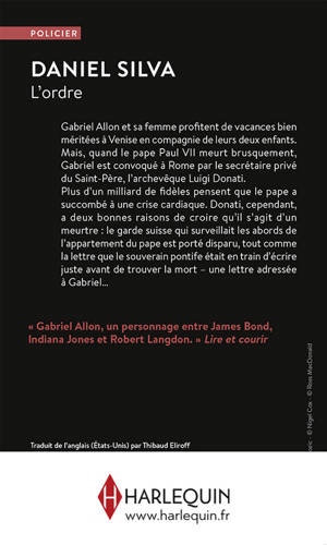 Gabriel Allon et sa femme profitent de vacances bien méritées à Venise en compagnie de leurs deux enfants. Mais, quand le pape Paul VII meurt brusquement, Gabriel est convoqué à Rome par le secrétaire privé du Saint-Père, l’archevêque Luigi Donati. Plus d’un milliard de fidèles pensent que le pape a succombé à une crise cardiaque. Donati, cependant, a deux bonnes raisons de croire qu’il s’agit d’un meurtre : le garde suisse qui surveillait les abords de l’appartement du pape est porté disparu, tout comme la lettre que le souverain pontife était en train d’écrire juste avant de trouver la mort – une lettre adressée à Gabriel… Traduit de l’anglais (États-Unis) par Thibaud Eliroff.