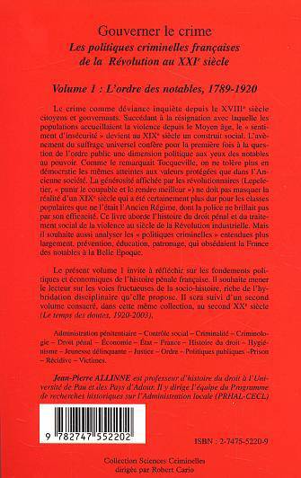 Le crime comme déviance inquiète depuis le XVIIIe siècle citoyens et gouvernants. Succédant à la résignation avec laquelle les populations accueillaient la violence depuis le Moyen âge, le " sentiment d'insécurité " devient au XIXe siècle un construit social. Ce livre aborde l'histoire du droit pénal et du traitement social de la violence au siècle de la Révolution industrielle. Mais il souhaite aussi analyser les " politiques criminelles " entendues plus largement, prévention, éducation, patronage, qui obsédaient la France des notables à la Belle Époque.