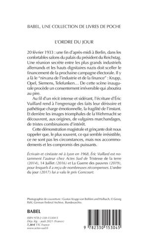 20 février 1933 : une fin d'après-midi à Berlin, dans les confortables salons du Palais du président du Reichstag. Une réunion secrète entre les plus grands industriels allemands et les hauts dignitaires nazis doit sceller le financement de la prochaine campagne électorale. Il y a là "le nirvana de l'industrie et de la finance" : Krupp, Opel, Siemens, Telefunken... De cette scène inaugurale procède un consentement irréversible qui aboutira au pire. Au fil d'un récit intense et sidérant, l'écriture d'Éric Vuillard rend à l'engrenage des faits leur dérisoire et pathétique charge émotionnelle, la fragilité de l'instant. Et derrière les images triomphales de la Wehrmacht se découvrent, aux origines, de vulgaires marchandages, de tristes combinaisons d'intérêt. Cette démonstration magistrale et grinçante doit nous rappeler que, le plus souvent, ce qui semble irrésistible, ce ne sont pas les circonstances, mais nos accomodements et les compromis des puissants.