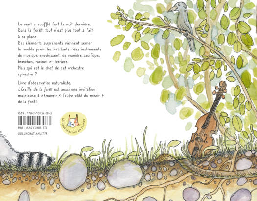 L’oreille de la forêt est une invitation malicieuse à découvrir « l’autre côté du miroir » de la forêt. <br /> À la fois tableau de botanique et oeuvre de naturaliste, les dessins d’Arnaud Descheemacker présentent <br /> avec le plus grand souci du détail et la plus grande rigueur scientifique la faune et la flore de la forêt <br /> européenne. Et pourtant des éléments imprévus et déroutants viennent semer le trouble parmi<br /> cette population : des instruments de musiques envahissent, de manière pacifique, branches, racines<br /> et terriers. Comment les habitants de la forêt vont-ils réagir ? Et qui est le chef de cet orchestre sylvestre ?<br /> Une écriture poétique donne son souffle aux images et rythme la narration.