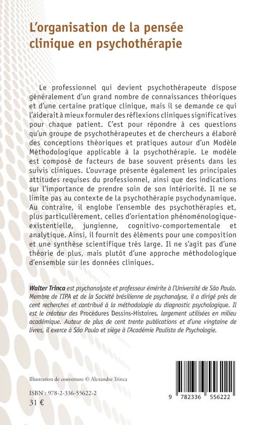 Le professionnel qui devient psychothérapeute dispose généralement d'un grand nombre de connaissances théoriques et d'une certaine pratique clinique, mais il se demande ce qui l'aiderait à mieux formuler des réflexions cliniques significatives pour chaque patient. C'est pour répondre à ces questions qu'un groupe de psychothérapeutes et de chercheurs a élaboré des conceptions théoriques et pratiques autour un Modèle Méthodologique applicable à la psychothérapie. Le modèle est composé de facteurs de base souvent présents dans les suivis cliniques. L'ouvrage présente également les principales attitudes requises du professionnel, ainsi que des indications sur l'importance de prendre soin de son intériorité. Il ne se limite pas au contexte de la psychothérapie psychodynamique. Au contraire, il englobe l'ensemble des psychothérapies et, plus particulièrement, celles d'orientation phénoménologique-existentielle, jungienne, cognitivo-comportementale et analytique. Ainsi, il fournit des éléments pour une composition et une synthèse scientifique très large. Il ne s'agit pas d'une théorie de plus, mais plutôt d'une approche méthodologique d'ensemble sur les données cliniques.
