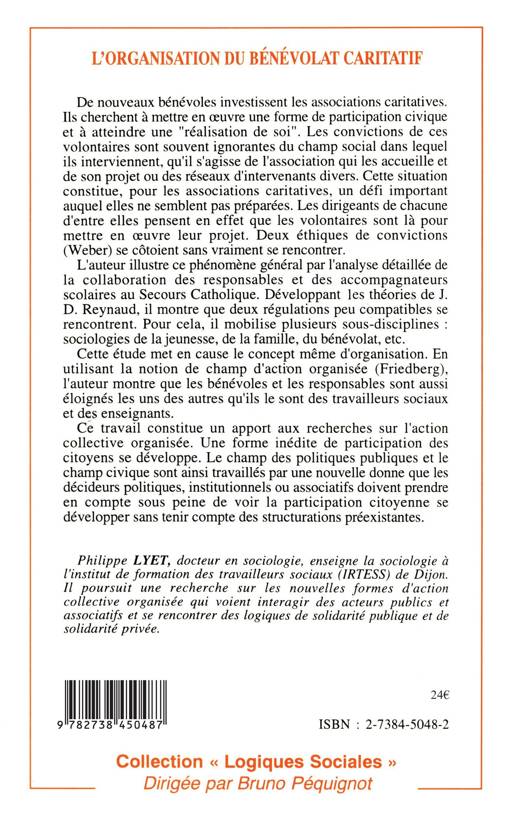 Des nouveaux bénévoles investissent les association caritatives. Ils cherchent à mettre en oeuvre une forme de participation civique et à atteindre une " réalisation de soi ". Ce travail constitue un apport aux recherches sur l'action collective organisée. Une forme inédite de participation des citoyens se développe. Le champ des politiques publiques et le champ civique sont ainsi travaillés par une nouvelle donne que les décideurs politiques, institutionnels ou associatifs doivent prendre en compte sous peine de voir la participation citoyenne se développer sans tenir compte des structurations préexistantes.