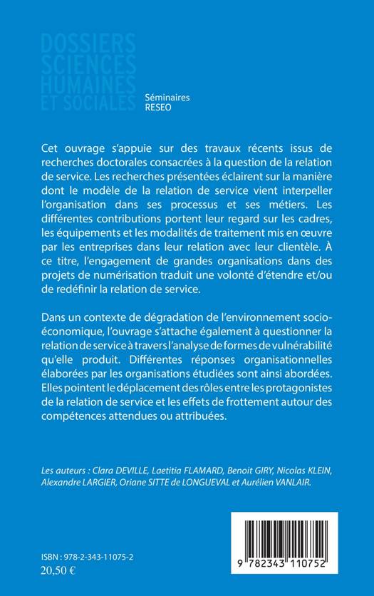 L'ouvrage analyse la manière dont le modèle de la relation de service vient interpeller l'organisation dans ses processus et ses métiers. À ce titre, l'engagement de grandes organisations dans des projets de numérisation traduit une volonté d'étendre et/ou de redéfinir la relation de service. Dans un contexte de dégradation de l'environnement socio-économique, l'ouvrage s'attache également à questionner la relation de service à travers l'analyse de formes de vulnérabilité qu'elle produit.
