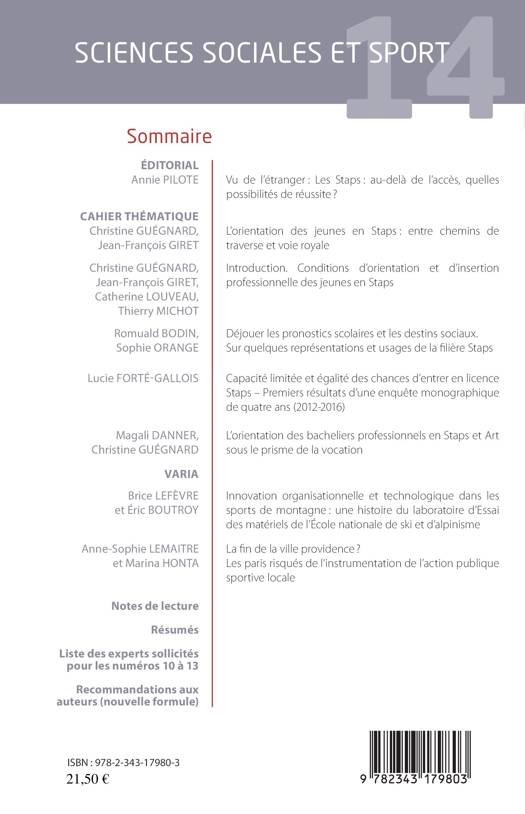 Ce numéro de Sciences sociales du sport met en lumière différentes questions sur l'orientation des jeunes vers la filière universitaire Staps : quelles possibilités de réussite à l'étranger ? Les conditions d'orientation et d'insertion professionnelle, la capacité limitée et l'égalité des chances d'entrer en licence Staps à travers une enquête monographique de quatre ans (2012-2016) sur ce sujet.