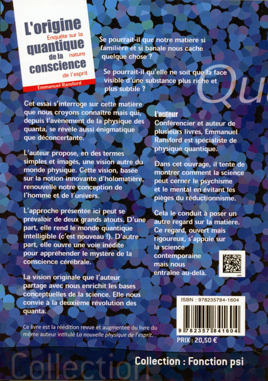 Se pourrait-il que notre matière si familière et si banale nous cache quelque chose ? Qu'elle ne soit que la face visible d'une substance plus riche et plus subtile ? Cet essai s'interroge sur cette matière que nous croyons connaître mais qui, depuis l'avènement de la physique des quantas, se révèle aussi énigmatique que déconcertante. L'auteur propose, en des termes simples et imagés, une vision autre du monde physique. Cette vision originale renouvelle notre conception de l'homme et de l'univers. Elle permet même d'envisager, sur des bases inédites, la perspective d'une authentique conscience artificielle.