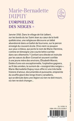 Marie-Bernadette Dupuy nous offre ici une très belle histoire d'amour documentée et puissante, empreinte du souffle glacé des longs hivers québécois, qui se déroule dans une région où rien ne doit mourir, rien ne doit changer...