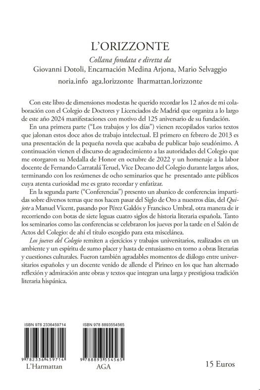 Los jueves del Colegio remiten a ejercicios y trabajos universitarios, realizados en un ambiente y un espíritu de sumo placer y hasta de entusiasmo en tomo a obras literarias y cuestiones culturales. Fueron también agradables momentos de diálogo entre universitarios españoles y un docente venido de allende el Pirineo en los que han alternado reflexión y admiración ante obras y textos que integran una larga y prestigiosa tradición literaria hispánica.