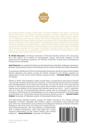 By bringing sensory studies to the study of Persian literature and culture, Losing Our Minds, Coming to Our Senses: Sensory Readings of Persian Literature and Culture inaugurates a new chapter for Iranian and Persian studies. This volume offers a diverse set of readings across periods, genres and forms throughout Persian literary history, demonstrating the value of sensory studies as an approach to Persian cultural production, literary or otherwise. The book's chapters conceptualize sensory aesthetics in the context of Persian literature and suggest ways in which sensory studies can be used to reimagine and enrich existing approaches to Persian literature. The volume sheds light on the scope of Persianate sensoria over the long, rich history of Persian letters. In doing so, it also offers a new model for a comparative approach to the study of Persian literary works through the larger field of sensory studies.