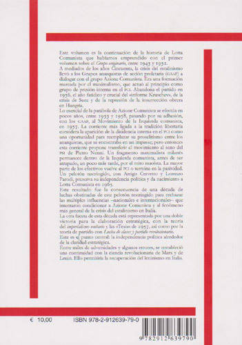 Este volumen es la continuación de la historia de Lotta Comunista que habíamos emprendido con el primer volumen sobre el Grupo originario, entre 1943 y 1952. A mediados de los años Cincuenta, la crisis del estalinismo llevó a los GAAP a dialogar con el grupo Azione Comunista. No obstante, la mayor parte de los efectivos terminó por volver al PCI o en la pasividad. Un pelotón restringido, con Arrigo Cervetto y Lorenzo Parodi, preserva su independencia política y da nacimiento a Lotta Comunista en 1965. Entre miles de adversidades y algunos errores, se restableció una continuidad con la ciencia revolucionaria de Marx y de Lenin.