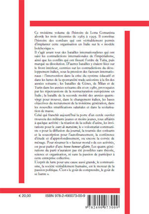 Ce troisième volume de l’histoire de Lotta Comunista aborde les trois décennies de 1965 à 1995. Il constitue l’histoire des combats qui ont véritablement permis d’implanter cette organisation en Italie sur le « modèle bolchevique ». Il s’agit avant tout des batailles internationalistes qui ont saisi les contradictions internationales de l’impérialisme, ainsi que les conflits qui ont fissuré l’ordre de Yalta, puis marqué sa dissolution. D’autres batailles y étaient liées sur le front intérieur, centrées sur les contradictions du développement italien, sous la pression des facteurs internationaux : l’intervention dans la crise du système éducatif et dans les luttes de la spontanéité trade-unioniste à la fin des années soixante; les batailles de Gênes, de Milan et de Turin dans les années soixante-dix et en 1980, provoquées par les répercussions de la restructuration européenne en Italie; la bataille de la seconde moitié des années quatre-vingt pour trouver, dans le changement italien, les bases objectives du recrutement de la troisième génération, dans les nouvelles stratifications salariales et dans la scolarisa-tion de masse. Celui qui franchit aujourd’hui la porte d’un cercle ouvrier trouvera des militants jeunes et moins jeunes, tous affairés à quelque activité : la réunion de la cellule d’usine, les invitations pour le cours de marxisme, le « volontariat communiste » pour la diffusion du journal, la tournée des cotisants et la souscription pour l’autofinancement, la conférence d’étude et d’approfondissement, ou encore la corvée de ménage. Pour résumer le « facteur moral » de ces activités, on peut parler d’une bonne humeur affairée. Les quatre générations du parti n’auraient pas été possibles sans théorie, science et organisation, ni sans la passion de participer à cette entreprise collective. L’esprit de lutte pour une cause aussi grande, le communisme, la société véritablement humaine, est le moteur de la passion politique. C’est « le goût de comprendre, le goût de se battre ».