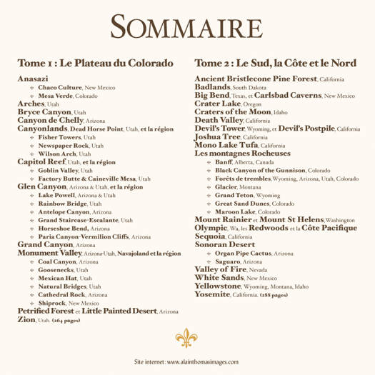 Le Livre d’Or des parcs et du voyage dans l’Ouest américain rassemble, en deux volumes, toutes les grandes signatures naturelles qui fondent la réputation universelle du pays. Contrairement à la plupart des ouvrages parus sur le sujet, il ne vous propose pas un empilage de photographies prises de-ci de-là au gré des circonstances et de l’inspiration du photographe, mais une documentation iconographique véritable, enrichie de textes pertinents, un guide de voyage avant la lettre qui se doublera, au retour, d’un album de souvenirs (toutes les photographies qui le composent ont été prises au sol dans des parcs de grand renom, notoirement accessibles au public). Au regard des seuls chiffres, le Livre d’Or des parcs et du voyage dans l’Ouest américain est un ouvrage d’exception : deux tomes totalisant 552 pages et 343 photographies numérisés à... 240 millions de pixels. Votre serviteur a, quant à lui, dans le respect du lecteur, parcouru 500.000 kilomètres dans l’Ouest américain et arpenté vingt fois, de l’aube au crépuscule, tous les parcs naturels du pays. Il est en cela le digne successeur, largement augmenté (notamment de 90% de photos nouvelles), de son ancêtre à succès maintes fois plagié : "Voyage dans l'Ouest américain".