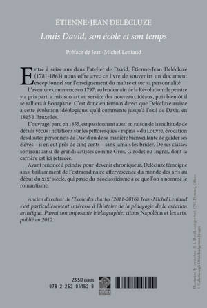 Entre a seize ans dans l'atelier de David, Etienne-Jean Delecluze (1781-1863) nous offre avec ce livre de souvenirs un document exceptionnel sur l'enseignement du maitre et sur sa personnalite. L'aventure commence en 1797, au lendemain de la Revolution: le peintre y a pris part, a mis son art au service des nouveaux ideaux, puis bientot il se ralliera a Bonaparte. C'est donc en temoin direct que Delecluze assiste a cette evolution ideologique, qu'il commente jusqu'a l'exil de David en 1815 a Bruxelles. L'ouvrage, paru en 1855, est passionnant aussi en raison de la multitude de details vecus: notations sur les pittoresques " rapins " du Louvre, evocation des doutes personnels de David ou de sa maniere bienveillante de guider ses eleves - il en eut pres de cinq cents - sans jamais les brider. De ses classes sortiront ainsi de grands artistes comme Gros, Girodet ou Ingres, dont la carriere est ici retracee. Ayant renonce a peindre pour devenir chroniqueur, Delecluze temoigne ainsi brillamment de l'extraordinaire effervescence du monde des arts au debut du XIXe siecle, qui passe du neoclassicisme a ce que l'on a nomme le romantisme.