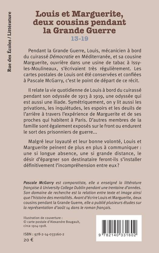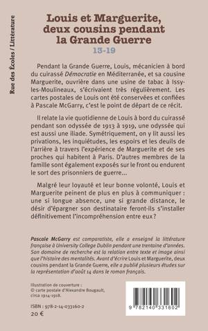 Pendant la Grande Guerre, Louis, mécanicien à bord du cuirassé Démocratie en Méditerranée, et sa cousine Marguerite, ouvrière dans une usine de tabac à Issy- les-Moulineaux, s' écrivaient très régulièrement. Les cartes postales de Louis ont été conservées et confiées à Pascale McGarry, c' est le point de départ de ce récit. Il relate la vie quotidienne de Louis à bord du cuirassé pendant son odyssée de 1913 à 1919, une odyssée qui est aussi une iliade. Symétriquement, on y lit aussi les privations, les inquiétudes, les espoirs et les deuils de l arrière à travers l expérience de Marguerite et de ses proches qui habitent à Paris. D autres membres de la famille sont également exposés sur le front ou endurent le sort des prisonniers de guerre Malgré leur loyauté et leur bonne volonté, Louis et Marguerite peinent de plus en plus à communiquer : une si longue absence, une si grande distance, le désir d épargner son destinataire feront-ils s installer définitivement l incompréhension entre eux ?