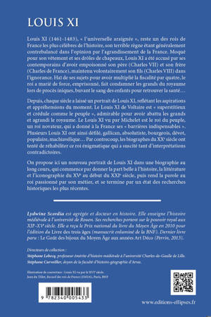 Louis XI (1461-1483), « l’universelle araignée », reste un des rois de France les plus célèbres de l’histoire, son terrible règne étant généralement contrebalancé dans l’opinion par l’agrandissement de la France. Moqué pour son vêtement et ses drôles de chapeaux, Louis XI a été accusé par ses contemporains d’avoir empoisonné son père (Charles VII) et son frère (Charles de France), maintenu volontairement son fi ls (Charles VIII) dans l’ignorance. Haï de ses sujets pour avoir multiplié la fi scalité par quatre, le roi a marié de force, emprisonné, fait condamner les grands du royaume lors de procès iniques, buvant le sang des enfants pour retrouver la santé…