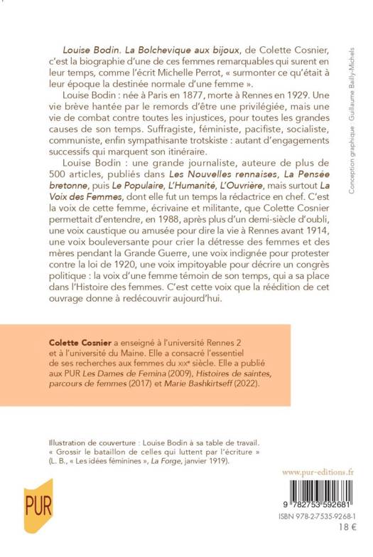 Louise Bodin : une grande journaliste, auteure de plus de 500 articles, publiés dans Les Nouvelles rennaises, La Pensée bretonne, puis Le Populaire, L’Humanité, L’Ouvrière, mais surtout La Voix des Femmes, dont elle fut un temps la rédactrice en chef. C’est la voix de cette femme, écrivaine et militante, que Colette Cosnier permettait d’entendre, en 1988, après plus d’un demi-siècle d’oubli, une voix caustique ou amusée pour dire la vie à Rennes avant 1914, une voix bouleversante pour crier la détresse des femmes et des mères pendant la Grande Guerre, une voix indignée pour protester contre la loi de 1920, une voix impitoyable pour décrire un congrès politique : la voix d’une femme témoin de son temps, qui a sa place dans l’Histoire des femmes. C’est cette voix que la réédition de cet ouvrage donne à redécouvrir aujourd’hui.