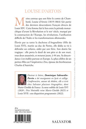 Après l'étude d'autres figures de la monarchie, Dominique Sabourdin Perrin consacre ce livre à la vie de Louise d'Artois 1819 1864 qui est avec son frère, le comte de Chambord, la dernière descendante française directe de Louis XIV (si on ne tient pas compte de la branche espagnole). Cette femme fait le lien entre la période monarchique d'avant la Révolution et le XIX e siècle, marqué par la construction de l'Europe, les révolutions, l'unification difficile de l'Italie et les transformations allemandes. Élevée par sa grand tante Clothilde, fille de Louis XVI, mariée au duc de Parme, elle dédia sa vie à défendre ses enfants, aidée par son frère. Son destin fut tragique elle souffrit l'assassinat de son père puis de son mari et mourut jeune, à 44 ans. Sa descendance vit partout en Europe La plus célèbre de ses petites filles est l'impératrice Zita, épouse du bienheureux Charles d'Autriche.