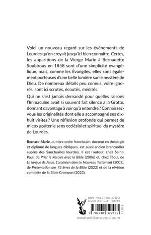 Voici un nouveau regard sur les événements de Lourdes qu'on croyait jusqu'ici bien connaître. Certes, les apparitions de la Vierge Marie à Bernadette Soubirous en 1858 sont d'une simplicité évangélique, mais, comme les Évangiles, elles sont également porteuses d'une belle lumière sur le mystère de Dieu. De nombreux détails peu connus, voire ignorés, sont ici scrutés, écoutés, médités. Qui ne s'est jamais demandé pour quelles raisons l'Immaculée avait si souvent fait silence à la Grotte, donné davantage à voir qu'à entendre, accompagné ses dix-huit visites d'originalités que la jeune Bernadette illettrée n'aurait jamais pu inventer ? Dans ces pages, après le temps du repérage historique, vient celui de la réflexion profonde qui permet de mieux goûter le sens ecclésial et spirituel du mystère de Lourdes.