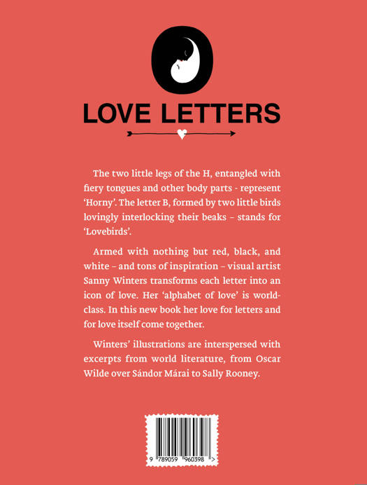 Discover the 'Alphabet of Love' with each letter representing an aspect of love as an illustration, interspersed with excerpts from world literature. The two little legs of the H, entangled with fiery tongues and other body parts - represent 'Horny'. The B, formed by two little birds lovingly interlocking their beaks - stands for 'Lovebirds'. The 'Alphabet of Love' by illustrator Sanny Winters is world-class. Her love for letters and for love itself come together in her new book, where her illustrations are interspersed with excerpts from world literature. Armed with nothing but red, black, and white - and tons of inspiration - she transforms each letter into an icon of love.