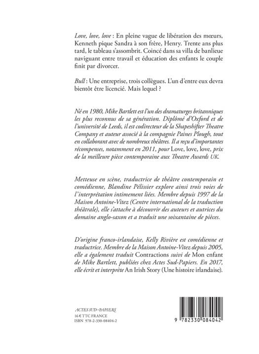 «Né en 1980, Mike Bartlett est l'un des dramaturges britanniques les plus reconnus de sa génération. Diplômé d'Oxford et de l'université de Leeds, il est codirecteur de Shapeshifter Theatre Company et auteur associé à la compagnie Paines Plough, tout en collaborant avec de nombreux théâtres. Il a reçu d'importantes récompenses, notamment en 2011, pour »Love, love, love,« prix de la meilleure pièce contemporaine aux Theatre Awards UK. »
