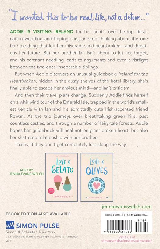 And then their travel plans change. Suddenly Addie finds herself on a whirlwind tour of the Emerald Isle, trapped in the world's smallest vehicle with Ian and his admittedly cute, Irish-accented friend Rowan. As the trio journeys over breathtaking green hills, past countless castles, and through a number of fairy-tale forests, Addie hopes her guidebook will heal not only her broken heart, but also her shattered relationship with her brother.