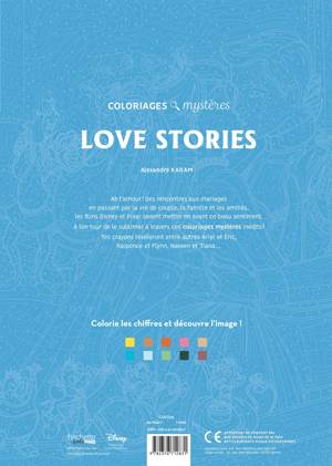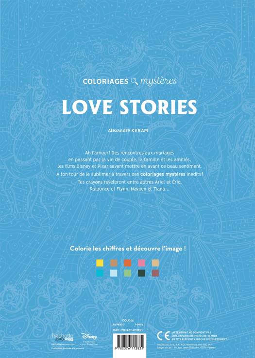 Ah l'amour ! Des rencontres aux mariages en passant par la vie de couple, la famille et les amitiés, les films Disney et Pixar savent mettre en avant ce beau sentiment. À ton tour de le sublimer à travers ces 100 coloriages mystères inédits ! Tes crayons te révêleront entre autres Ariel et Éric, Raiponce et Flynn...