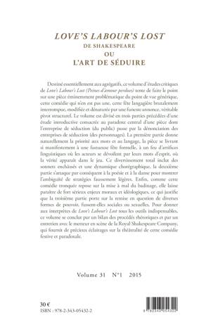 Destiné aux agrégatifs, ce volume d'études critiques tente de faire le point sur une pièce de Shakespeare : une comédie qui n'en est pas une, une fête langagière brutalement interrompue, modifiée et dénaturée par une funeste annonce, véritable pivot structurel. En perspective des procédés rhétoriques et de la théâtralité de cette comédie paradoxale, la première partie est dédiée aux mots et au langage, la deuxième à la poésie, la troisième à la remise en question de diverses formes de pouvoir, sociales ou sexuelles.