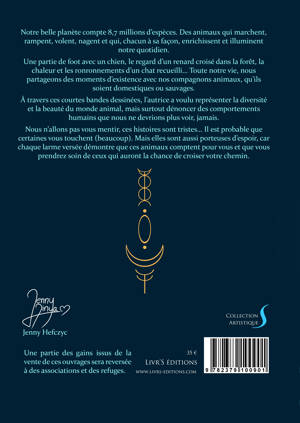 "Notre belle planète compte 8,7 millions d’espèces. Des animaux qui marchent, rampent, volent, nagent et qui, chacun à sa façon, enrichissent et illuminent notre quotidien. Une partie de foot avec un chien, le regard d’un renard croisé dans la forêt, la chaleur et les ronronnements d’un chat recueilli… Toute notre vie, nous partageons des moments d’existence avec nos compagnons animaux, qu’ils soient domestiques ou sauvages. À travers ces courtes bandes dessinées, l’autrice a voulu représenter la diversité et la beauté du monde animal, mais surtout dénoncer des comportements humains que nous ne devrions plus voir, jamais. Nous n’allons pas vous mentir, ces histoires sont tristes… Il est probable que certaines vous touchent (beaucoup). Mais elles sont aussi porteuses d’espoir, car chaque larme versée démontre que ces animaux comptent pour vous et que vous prendrez soin de ceux qui auront la chance de croiser votre chemin."