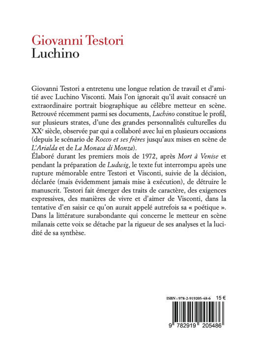1. L'auteur de Luchino, Giovanni Testori (1923-1993), est l'un des auteurs majeurs de la littérature italienne du XXe siècle. Écrivain, poète, critique d'art, dramaturge et peintre, Testori a entretenu une longue relation d'amitié et de travail avec Luchino Visconti. Le réalisateur s'est notamment inspiré de l'un de ses livres majeurs, Il ponte della Ghisolfa, pour son film Rocco e i suoi fratelli (Grand prix du jury à la Mostra de Venise en 1960, avec Alain Delon). 2. Luchino est un portrait très original que Giovanni Testori a écrit au début des années 1970 et qui constitue un témoignage significatif du lien profond qui unissait ces deux grands artistes. Il est resté inachevé et inédit à la suite d'une rupture mémorable entre les deux amis. Oublié et considéré comme perdu, très récemment Luchino a refait surface des archives Testori et a été publié en Italie à l'automne 2022. 3. Pour tous ceux qui aiment le cinéma italien de la seconde moitié du XXe siècle et, en particulier, le cinéma de Visconti, Luchino est un livre extraordinairement intéressant : ni biographie classique, ni étude critique, Luchino est avant tout un hommage émouvant au génie créatif de l'une des plus grandes figures de la mise en scène cinématographique et théâtrale du siècle dernier. 4. La personnalité complexe de Visconti, ses obsessions, sa relation avec sa mère, ses passions (les chevaux, les maisons...), son engagement politique, son extraordinaire capacité à raconter avec lucidité la crise et la dissolution de la bourgeoisie, jusqu'à l'extrême, au-delà du dégoût, sont mis en lumière dans ce portrait grâce à une écriture très sensible et profondément proche des instances les plus profondes de la poétique du grand metteur en scène. 5. Dans l'abondante littérature sur le réalisateur milanais, la voix de Testori se distingue par la rigueur de l'analyse et la lucidité de la synthèse. Le livre est accompagné d'une introduction de Giovanni Agosti qui vise à clarifier les nombreuses allusions disséminées dans le texte et, d'autre part, se veut le point de départ d'investigations sur les interférences entre les deux auteurs, et sur leurs mondes, contigus mais distants, avec des aperçus sur les maisons, les collections d'art, les amitiés... 6. Le livre est complété par un dossier photographique qui illustre certains moments clés de la collaboration entre Testori et Visconti, en particulier la mise en scène d'Arialda, le drame de Testori monté par Visconti d'abord à l'Eliseo de Rome et ensuite au Teatro Nuovo de Milan où, après une seule représentation, en 1961, il fut retiré de l'affiche et censuré sur ordre du juge Carmelo Spagnuolo qui avait déjà réservé le même traitement à Rocco et à ses frères l'année précédente.
