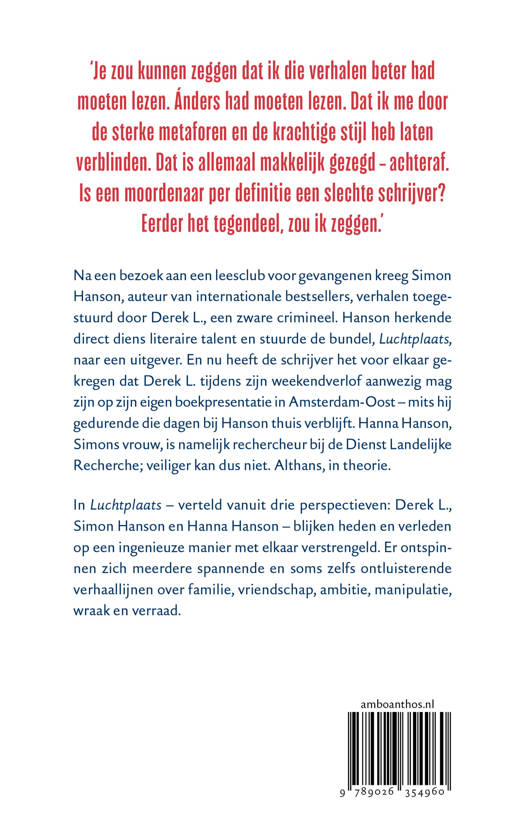 Na een bezoek aan een leesclub voor gevangenen krijgt Simon Hanson, auteur van internationale bestsellers, verhalen van de zware crimineel Derek L. toegestuurd. Hanson herkent direct diens literaire talent en stuurt de bundel, Luchtplaats genaamd, naar een uitgever. En nu heeft de schrijver het voor elkaar gekregen dat Derek L. tijdens zijn weekendverlof aanwezig mag zijn op zijn eigen boekpresentatie in Amsterdam-Oost – mits hij gedurende die dagen bij Hanson thuis verblijft. Hanna Hanson, Simons vrouw, is namelijk rechercheur zware en georganiseerde criminaliteit; veiliger kan dus niet. Althans, in theorie.