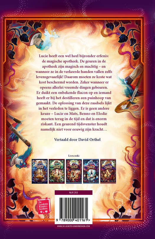 Lucie heeft een wel heel bijzonder erfenis: de magische apotheek. De geuren in de apotheek zijn magisch en machtig. En wanneer ze in de verkeerde handen vallen, zelfs levensgevaarlijk! Daarom moeten ze koste wat kost beschermd worden. Zeker wanneer er opeens allerlei vreemde dingen gebeuren. Er duikt een onbekende flacon op en iemand heeft er bij het destilleren een puinhoop van gemaakt. De oplossing van deze raadsels lijkt in het verleden te liggen. Er is geen andere keuze – de vrienden moeten terug in de tijd en dat is enorm riskant. Een geurend tijdsvenster houdt namelijk niet voor eeuwig zijn kracht…