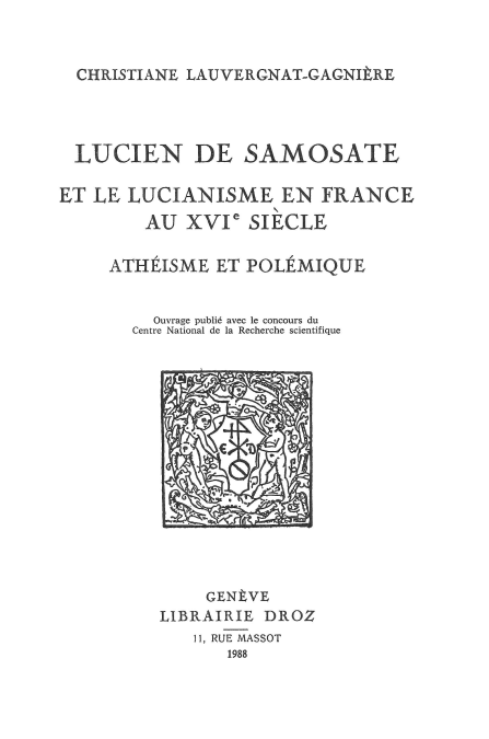 Cet ouvrage se propose essentiellement d'examiner, à la lumière de la tradition, le rôle réellement joué par Lucien dans l'élaboration d'une pensée athée (d'où le sous-titre). L'auteur étudie d'abord la diffusion de son oeuvre - à l'appui, une bibliographie des ouvrages du XVIe siècle qui lui sont consacrés - , puis esquisse un portrait du Lucianiste. En contrepoint est étudiée l'influence de Lucien sur quelques oeuvres qui ne s'inscrivent pas dans les luttes idéologico-religieuses du siècle.
