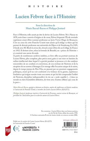 Face à l'Histoire, telle aurait pu être la devise de Lucien Febvre. Né à Nancy en 1878, mais franc-comtois d'origine et de coeur, Febvre fréquente l'Ecole normale supérieure avant d'être nommé professeur au lycée Victor-Hugo de Besançon. C'est au coeur de cette Franche-Comté tant aimée qu'il rédige sa thèse qui lui permet de devenir professeur aux universités de Dijon et de Strasbourg. En 1929, il fonde avec M. Bloch la revue des Annales avant d'être élu au Collège de France en 1932. Il devient alors, selon la formule de Braudel, un "prince de l'histoire" et construit une oeuvre féconde.