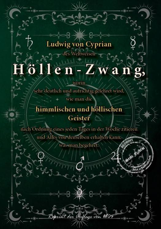 Dies ist ein Reprint eines Büchleins von 1904, aber bereits dieses teilte mit, daß der Originaltext aus der Pergamenthandschrift einer alten Klosterbibliothek von 1509 stammen solle. Wir haben das Büchlein für sie neu gesetzt. Da der Originaltitel zu lang für das Cover ist, wollen wir diesen hier wiedergeben: Ludwig von Cyprian des Weltweisen HöllenZwang, worin sehr deutlich und aufrichtig gelehret wird, wie man die himmlischen und höllischen Geister nach Ordnung eines jeden Tages in der Woche zitieren und Alles von denselben erhalten kann, was man begehret. Laut Original-Einleitung "sehen wir in diesem Buche einen kurzen Begriff der ganzen Magie, in welchem gleichsam als gegenwärtig die Geschäfte der Geister angezeigt werden, und wie man sie zu einer Unterredung anlocken und zwingen kann, auch Wort für Wort beschrieben stehet, was man täglich und stündlich dabei zu tun hat. In Summa: alle Gründe und principia der magischen Künste sind in diesem Buche, welches ein rechter Wegweiser zu denselben ist, begriffen." Mit der Anleitung magische Kreise zu errichten.