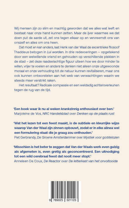 Dat moet en kan anders, laat Henk van der Waal de excentrieke filosoof Thaddeus betogen in Lui worden. In drie redevoeringen – opgetekend door een welwillende vriend en gehouden op verschillende plekken in de stad – zet deze raadselachtige figuur uiteen hoe we door minder te willen, vrijer te voelen en anders te denken niet alleen onze uitgewoonde moraal en onze verhouding tot de natuur kunnen revitaliseren, maar ons ook kunnen ontworstelen aan het web van verwachtingen waarin we steeds meer verstrikt raken.