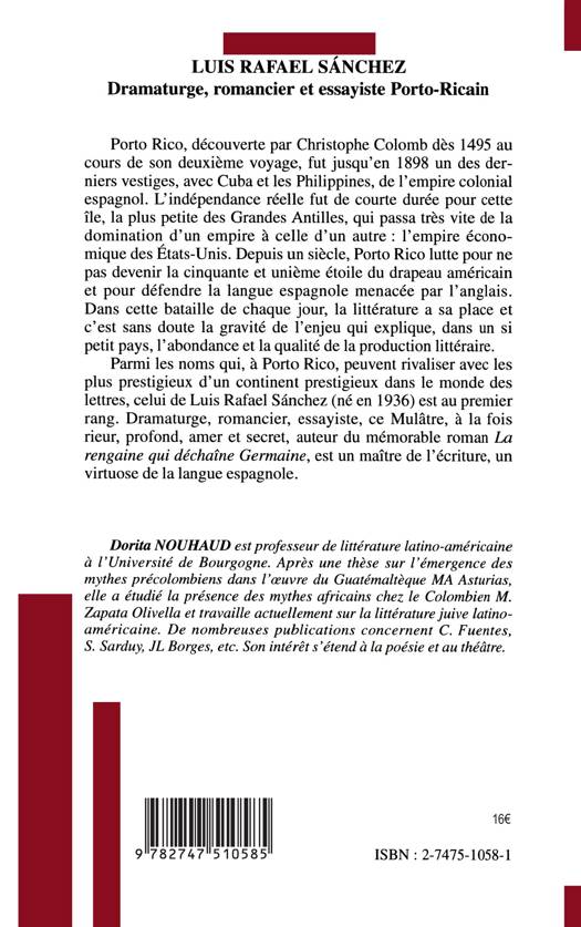 Parmi les noms qui, à Porto Rico, peuvent rivaliser avec les plus prestigieux d'un continent prestigieux dans le monde des lettres, celui de Luis Rafael Sánchez (né en 1936) est au premier rang. Dramaturge, romancier, essayiste, à la fois rieur, profond, amer et secret, auteur du mémorable roman La rengaine qui déchaîne Germaine, est un maître de l'écriture, un virtuose de la langue espagnole.