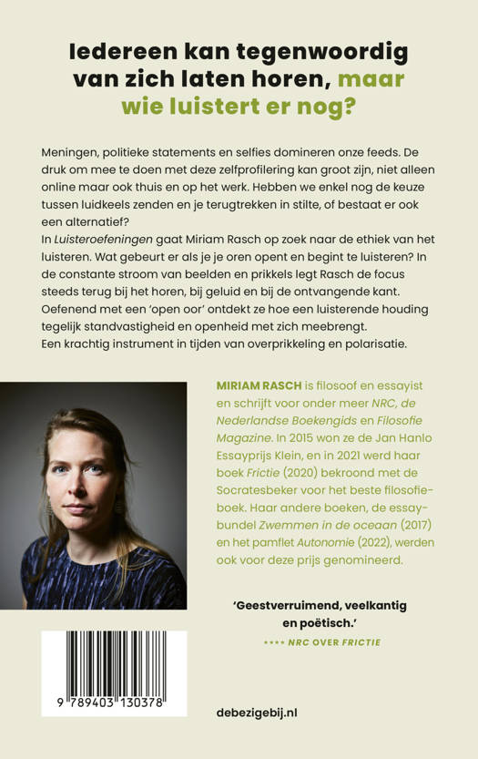 Als we luisteren ontstaat meteen een relatie tot het gehoorde: van aandacht en ontvankelijkheid, van geven en binnenlaten. Oefenend met een ‘open oor’ ontdekt Rasch hoe een luisterende houding tegelijk standvastigheid en openheid met zich meebrengt. Een krachtig instrument in tijden van overprikkeling en polarisatie, dat voor iedereen binnen handbereik ligt.