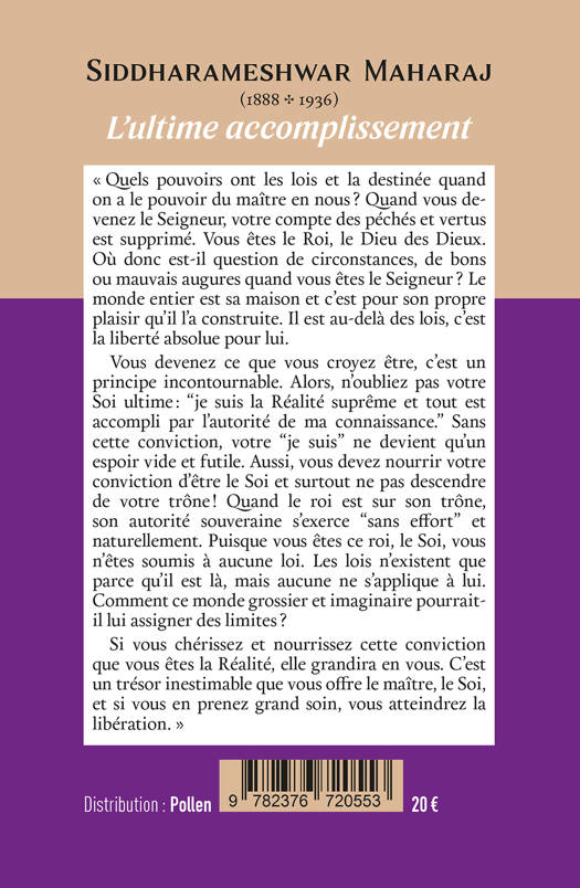 Siddharameshwar Maharaj est né en 1888 à Pathri, dans l’état du Maharashtra. Son maître, Bhausaheb Maharaj, enseignait la méditation comme moyen d’atteindre la connaissance de Soi, mais Siddharameshwar Maharaj, après avoir atteint la pleine compréhension de lui-même, enseigna par la suite la voie de la connaissance ou “voie de l’oiseau”. Le fondement de son enseignement est la philosophie de la non dualité (Advait Védanta) qui stipule qu’en Réalité, il n’y a que le Un et seulement le Un.<br /> “Le mental, l’intellect, les mots et les pensées ont tous surgi dans la mouvance de la conscience du “je”. Dans cet amalgame de mots et de noms, la seule chose qui importe est la reconnaissance du Soi. Le but de l’existence consiste à le reconnaître. C’est l’histoire éternelle du Soi que je vous raconte, cette histoire sacrée qui relate la transformation de l’homme en Dieu.”<br /> Siddharameshwar Maharaj laissa son corps en 1936, à l’âge de 48 ans, après avoir conduit de nombreux disciples à la compréhension ultime. Parmi eux Nisargadatta Maharaj et Ranjit Maharaj, maîtres contemporains qui ont tous deux adapté leur enseignement à une audience plus large de disciples indiens mais aussi occidentaux.