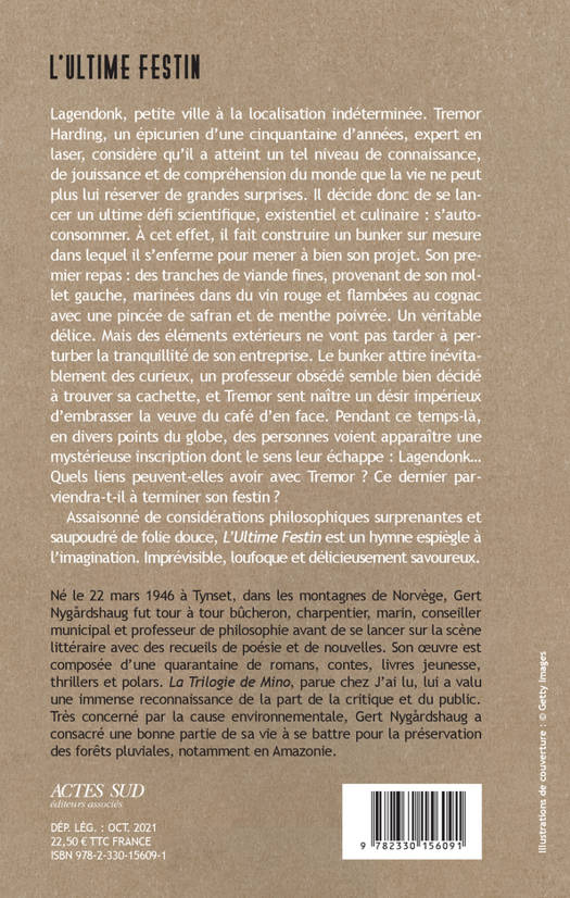 Lagendonk, petite ville à la localisation indéterminée. Tremor Harding, un épicurien d'une cinquantaine d'années, expert en laser, considère qu'il a atteint un tel niveau de connaissance, de jouissance et de compréhension du monde que la vie ne peut plus lui réserver de grandes surprises. Il décide donc de se lancer un ultime défi scientifique, existentiel et culinaire : s'auto-consommer. À cet effet, il fait construire un bunker sur mesure dans lequel il s'enferme pour mener à bien son projet. Son premier repas : des tranches de viande fines, provenant de son mollet gauche, marinées dans du vin rouge et flambées au cognac avec une pincée de safran et de menthe poivrée. Un véritable délice. Mais des éléments extérieurs ne vont pas tarder à perturber la tranquillité de son entreprise. Le bunker attire inévitablement des curieux, un professeur obsédé semble bien décidé à trouver sa cachette, et Tremor sent naître un désir impérieux d'embrasser la veuve du café d'en face. Pendant ce temps-là, en divers points du globe, des personnes voient apparaître une mystérieuse inscription dont le sens leur échappe : Lagendonk... Quels liens peuvent-elles avoir avec Tremor ? Ce dernier par-viendra-t-il à terminer son festin ? Assaisonné de considérations philosophiques surprenantes et saupoudré de folie douce, L'Ultime Festin est un hymne espiègle à l'imagination. Imprévisible, loufoque et délicieusement savoureux.