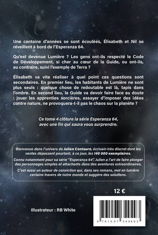 Élisabeth va vite réaliser à quel point ces questions sont secondaires. En premier lieu, les habitants de Lumière ne sont plus seuls : quelque chose de redoutable est là, tapis dans l'ombre. En second lieu, la Guide va devoir faire face au doute : jouer les apprenties sorcières, essayer d'imposer des idées contre nature, ne provoquera-t-il pas le chaos sur la planète ?