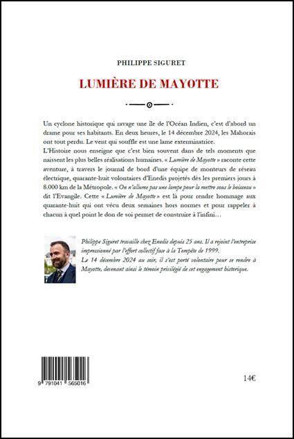Quelques mots sur l'auteur : Philippe Siguret travaille chez Enedis depuis 25 ans. Il a rejoint l'entreprise impressionné par l'effort collectif face à la tempête de 1999. Le 14 décembre 2024 au soir, il s'est porté volontaire pour se rendre à Mayotte, à la tête de la cohorte des 48, devenant ainsi le témoin privilégié de cet engagement historique.