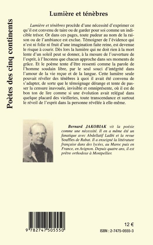 Lumière et ténèbres procède d'une nécessité d'exprimer ce qu'il est convenu de taire ou de garder pour soi comme un indicible trésor. Le poème tente d'être ressenti comme la parole de l'homme soudain libre, par le seul souci d'intégrité dans l'amour et dans la vie reçue et de la langue.