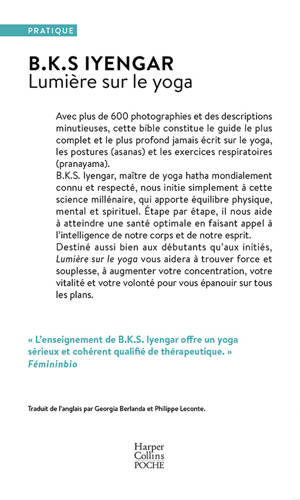 Avec plus de 600 photographies et des descriptions minutieuses, cette bible constitue le guide le plus complet et le plus profond jamais écrit sur le yoga, les postures (asanas) et les exercices respiratoires (pranayama). B.K.S. Iyengar, maître de yoga hatha mondialement connu et respecté, nous initie simplement à cette science millénaire, qui apporte équilibre physique, mental et spirituel. Étape par étape, il nous aide à atteindre une santé optimale en faisant appel à l’intelligence de notre corps et de notre esprit. Destiné aussi bien aux débutants qu'aux initiés, Lumière sur leyoga vous aidera à trouver force et souplesse, à augmenter votre concentration, votre vitalité et votre volonté pour vous épanouir sur tous les plans.