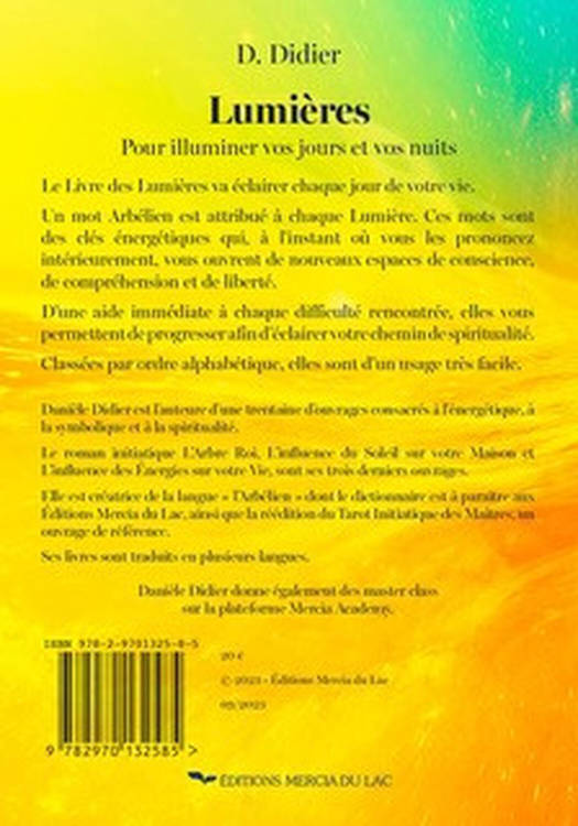 Le Livre des Lumières va éclairer chaque jour de votre vie. Un mot Arbélien est attribué à chaque Lumière. Ces mots sont des clés énergétiques, qui à l’instant où vous les prononcez intérieurement, vous ouvrent de nouveaux espaces de conscience, de compréhension et de liberté. D’une aide immédiate à chaque difficulté rencontrée, elles vous permettent de progresser afin d’éclairer votre chemin de spiritualité. Classées par ordre alphabétique, elles sont d’usage très facile.