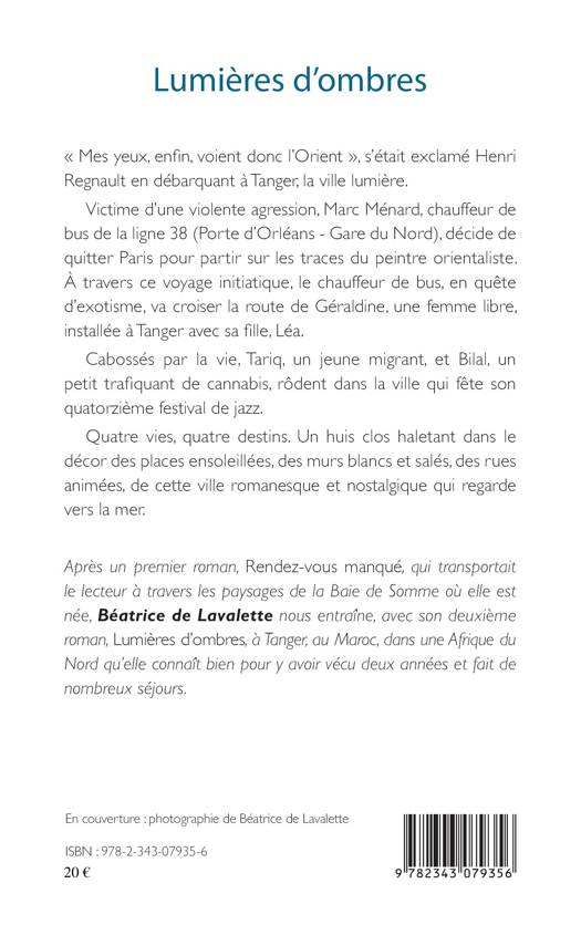 « Mes yeux, enfin, voient donc l'Orient » s'était exclamé Henri Regnault en débarquant à Tanger, la ville lumière. Victime d'une violente agression, Marc Ménard, chauffeur de bus, décide de quitter paris pour partir sur les traces du peintre orientaliste. À travers ce voyage initiatique, il va croiser la route de Géraldine, une femme libre, installée à Tanger avec sa fille. Cabossés par la vie, Tariq, un jeune migrant, et Bilal, un petit trafiquant de cannabis, rôdent dans la vile qui fête son quatorzième festival de jazz. Quatre vies, quatre destins. Un huis clos haletant dans le décor des places ensoleillées, des murs blancs et salés, des rues animées, de cette ville romanesque et nostalgique qui regarde vers la mer.